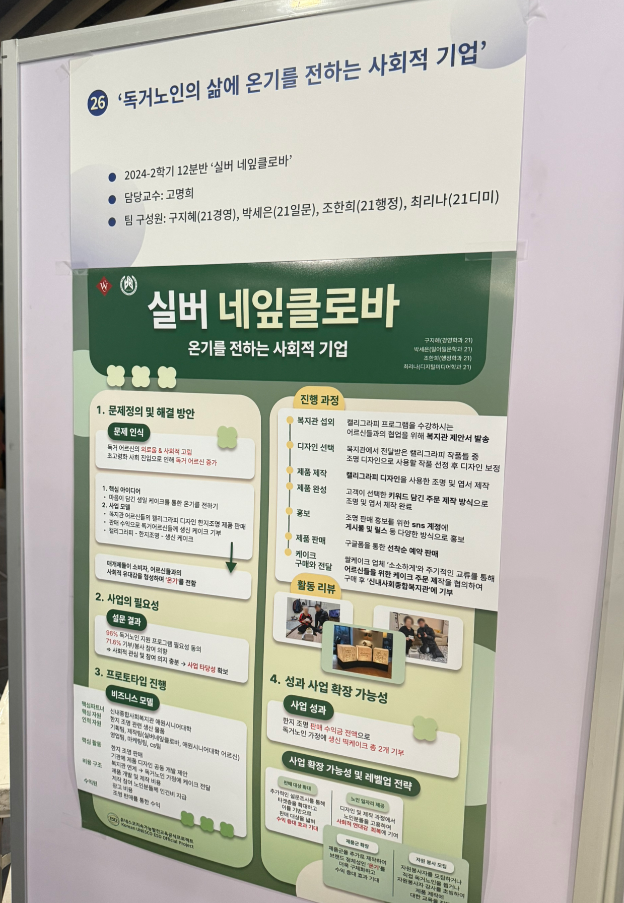 그중 대학생들의 프로젝트 활동 사례를 들으니 가슴 뭉클해요. 독거노인 어르신들에게 캘리그래피 한지조명(위 사진)을 판매한 기금으로 생일케이크를 선물했다고 하네요.