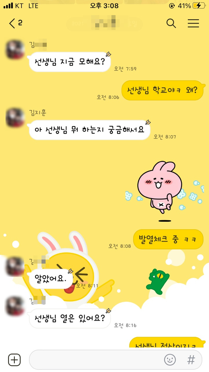 정확히 아이가 보낸 문자 그대로 쓰면, “선생님 지금 모해요?”이다. 내 안부를 묻는 2학년 아이의 이 문자에 나는 기분이 좋아진다. 아마도 그것은 고생한 만큼의 보람이 느껴져서 더 그런 마음이 드는 걸지도 모르겠다. 이 아이는 눈웃음이 정말 예쁜 아이이다. 그런데 한번 화가 나면 활화산 폭발하듯 어디로 튈지 모르는 아이기도 하다. 한 번은 교문 밖으로 뛰쳐나가 내 가슴을 철렁하게 만들기도 했다. 바로 어머니와 상담을 하고 관심을 끌려는 아이의 행동에 무관심으로 대응하자 문제 행동이 줄어들었다. 아침에 발열 검사할 때마다 “선생님, 왜 여기 있어요?”라며 따지듯이 묻던 아이가 사실은 선생님인 나를 좋아해서 그랬다는 것을 깨달은 것 마냥 기뻤다.