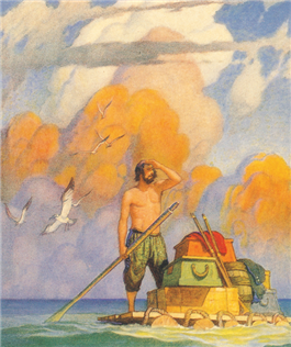 그런데 저 멀리 나무 위에 앵무새 한 마리가 있었다. 앵무새가 말했다. “나를 따라와 봐.” 소라와 민유는 신기해하며 앵무새를 따라갔다. 그곳에 가니 덥수룩한 수염과 머리를 한 구릿빛 피부의 남자가 있었다. “아니 이게 몇 년 만에 보는 사람이야! 사람을 만나다니 정말 기뻐!” 민유가 물었다. “당신은 누구인가요?” “나는 로빈슨 크루소야. 무인도에 표류해 몇 년째 혼자 지내고 있었지. 그런데 너희들은 여기에 대체 어떻게 온 거니? 그 옷은 뭐고?”
