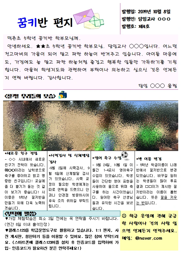 네 번째로는 정기적으로 학부모 편지를 발송한다. 허승환 선생님은 책에서 매주 보냈다고 하였으나 현재 나는 1학기에 3회 정도 보내고 있다. 그간 있었던 주요 학급(학교)활동, 아이들 사진, 부탁의 말씀, 안내 사항들을 A4 1쪽에 채워서 보내고 있다. 좀 더 숙달되고 익숙해지면 허승환 선생님처럼 2주에 한 번, 또는 매주 보내고자 한다. 원활한 학부모와의 소통으로 가정-학교간의 오해를 불식시키고 긴밀하게 협조하는 체제를 만들어나갈 수 있을 것이다.