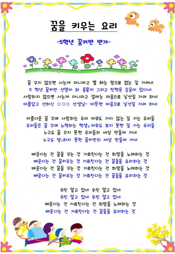두 번째로는 우리반 만의 반가를 만들었다. 작년 3학년 할 때는 동요 네잎클로버를 개사해서 내가 직접 만들어주었다.(라고 적고 학급경영책을 참고하였다고 읽는다.) 아이들이 어찌나 좋아하는지 시도 때도 없이 반가를 부르자고 하였고 덕분에 활기찬 반 분위기는 배가 되었다. 올해도 1학기에 내가 직접 만들어서(라고 적고 인***에서 참고하였다고 읽는다.) 아이들에게 안내하였는데 2학기가 되니 아이들이 반가를 바꾸자고 성화였다. 노래 목록으로 ♪오락실, ♪혼자라고 생각말기, ♪꿈꾸지 않으면 등이 나왔는데 간디학교 교가인 ♪꿈꾸지 않으면이 당선되었다. 이 노래에 맞춰 아이들이 직접 개사를 하였고 우리반만의 반가가 만들어졌다. 저학년에게는 쉽지 않겠지만 5학년이라 아이들의 창의적인 창작 능력을 활용해볼 수 있는 좋은 기회였다.