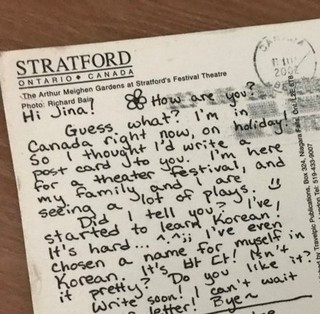 그래서 너한테 엽서를 써야겠다고 생각했어. 나는 연극 축제에 참석해서 연극을 많이 보러 왔어. :)