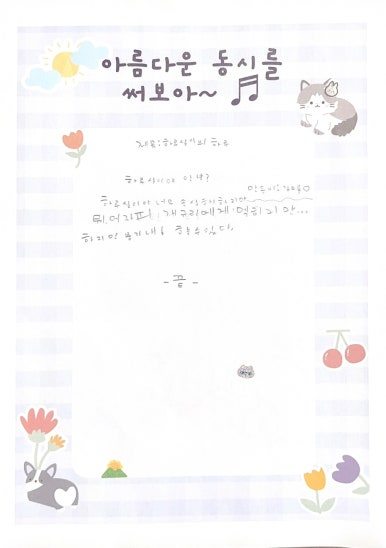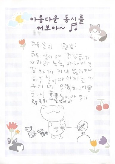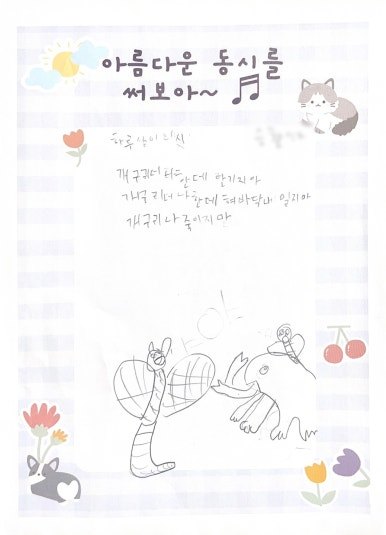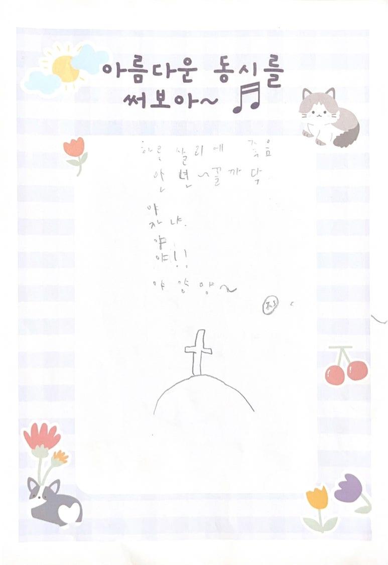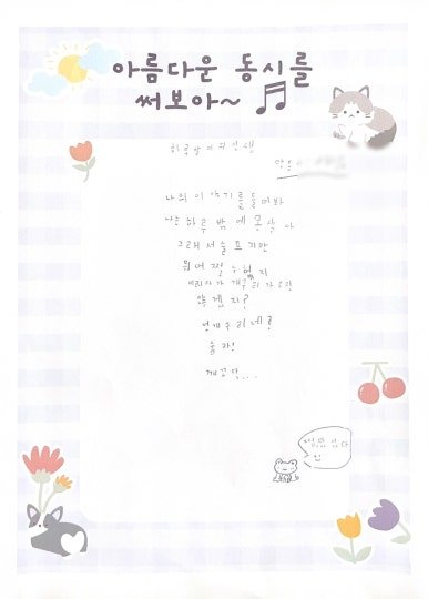 내가 쓴 동시를 예시로 보여주어서 그런지 시가 너무 비슷하게 나온 것이 안타까우면서도 아직 시 쓰기를 많이 해보지 않은 학생이라 일종의 모델링을 해준 것으로 생각하니 만족스럽기도 했다. 하지만 이 와중에도 자기만의 개성을 살린 시도 더러 보였다. 오늘은 편지 쓰기 방식으로 쓴 학생들도 있는데 다음에는 협력적 글쓰기로 시를 쓰거나 다른 유형의 글쓰기도 제시해 보아서 다양한 활동을 추가해 보아야겠다는 생각이 들었다. 좀 더 창조적인 표현의 기회를 주고 싶다. 전부다 발표를 해 보고 싶어 해서 40분이라는 시간이 정말 알차게 채워졌다.