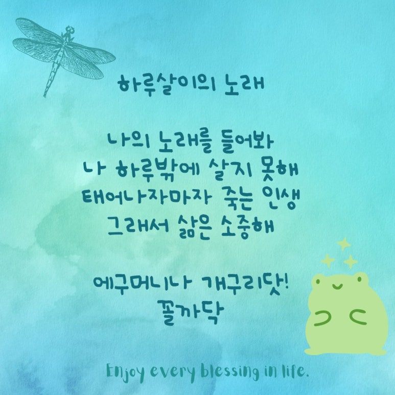 다음으로는 내가 직접 지은 동시인 <하루살이의 노래>를 들려주었다. 하루살이처럼 하루밖에 살지 못하는 마음을 이해해보고자 했는데 아직 저학년 학생들이라 삶의 유한성이나 죽음이라는 의미는 깊이 와닿지 않는지 아이들은 장난스럽게 대답했다.(우리 반은 MBTI 중 E(외향성)가 많다.) 그래서 이 분위기를 타고 바로 동시를 써보자고 제안했다. 외향적인 아이들의 특성에 맞게 발표 기회도 꼭 주었다.
