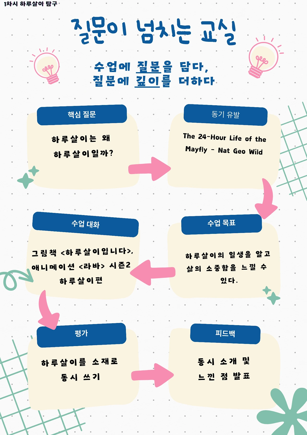 처음 하*이의 질문을 받았을 땐 당황스러우면서도 이내 어린 시절의 나로 돌아가 있었다. 분명 나도 어린 시절, 동네 골목을 걷다 보면 수많은 하루살이 떼에 눈살을 찌푸리면서 걸었던 기억이 있다. 그런데 그 시절 내가 하*이와 같은 질문을 해 보았었나? 떠올려 보니 잘 기억나지 않았다. 누군가는 뭐 이런 당연한 질문을 해?라고 할 수도 있지만, 나는 이러한 질문이야말로 아이들의 호기심과 지적 욕구를 채워줄 좋은 기회란 생각이 들었다. 그리고 이를 바탕으로 수업을 준비했고 오늘 5교시 창의적 체험활동 시간에 그 수업을 실시했다.