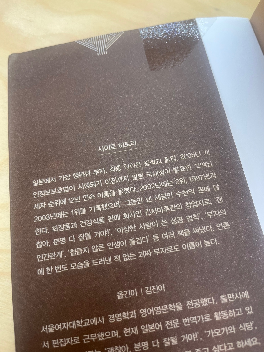 오늘 나는 신에게 선물을 하나 받았다. 그건 바로 도서관 추천 책 진열대에서 <사이토 히토리의 1퍼센트 부자의 법칙>이라는 책을 발견했기 때문이다. 문학을 좋아하다 보니 경제서적은 많이 읽지 않는 편이었는데 오늘은 왠지 이 책을 꼭 읽고 싶었다. 두께도 얇고 짧고 평이한 문장으로 되어 있어서 술술 읽혔다. 책날개에 저자 소개를 보면 ‘일본에서 가장 행복한 부자‘, ’세금만 수천억 원을 낸 부자'로 나온다. 더 놀라온 건 학벌을 중시하는 동아시아에서 중졸 출신이다.