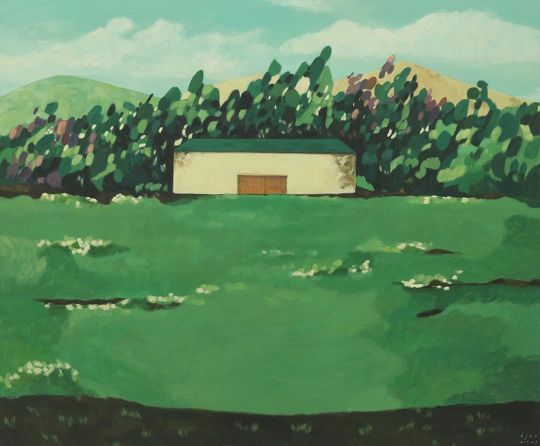 편평하게 칠한 평면적 표현도 매력적인데요. 풀 하나하나를 진짜처럼 묘사하지 않고 잔 붓터치를 과감히 생략합니다. 그의 한국화 작품에서 제주를 넘어 소박하고 맑은 한국의 미감을 발견하는 부분입니다.