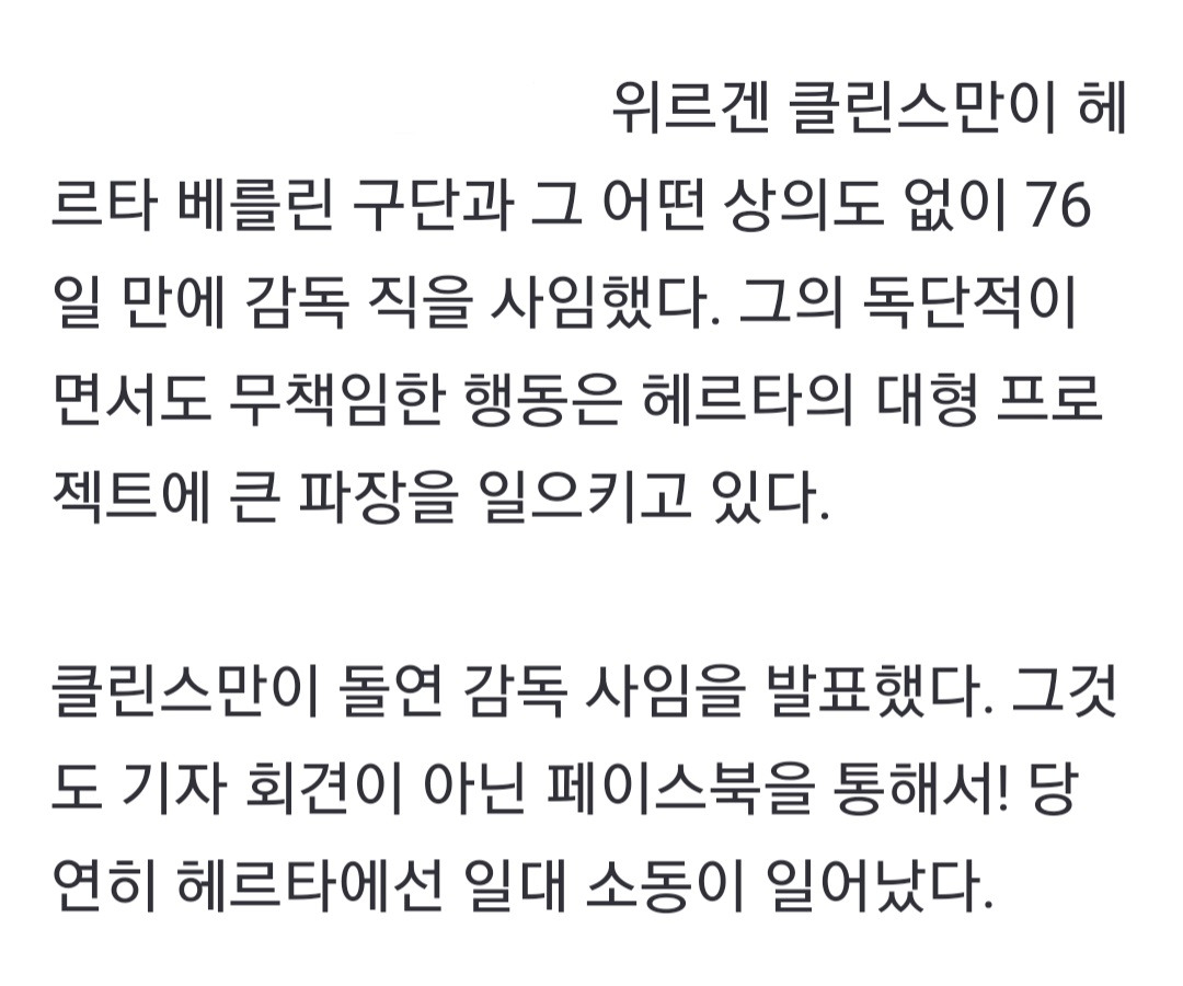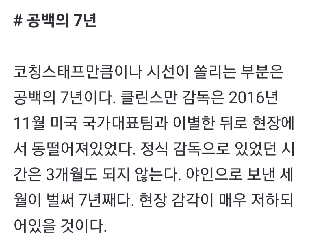 이러한 것들을 종합해 보았을 때 클린스만이 현재 한국 국가대표팀을 맡기에 적합한 감독이었는지 꼼꼼히 검증을 했어야 했다.
