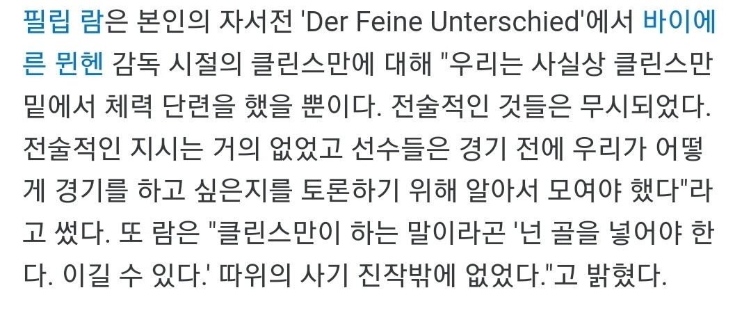 자국에서조차도 이렇게 평판이 좋지 못했고, 오죽했으면 같은 국가대표팀의 후배이자 전설인 필립 람의 자서전에까지 클린스만을 저격하는 글이 나왔다는 것은 그에 대한 냉정한 평가를 보여주는 것이다.