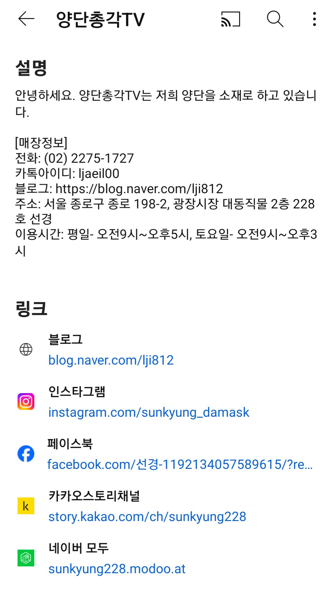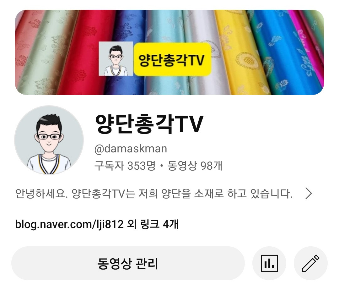유튜브는 ‘양단총각TV’라는 이름으로 운영하고 있다. ‘양단총각TV’는 판매하고 있는 양단과 양단으로 제작한 보자기, 이불 등 물건을 동영상으로 알리고자 제작했다. 시청자들에게 원하는 정보와 재미를 전달하기 위해 내가 직접 물건에 대해서 설명하고, 스토리텔링도 가미하면서 자막까지 올리고 있다. 거기다 SNS도 찾기 쉽도록 유튜브 ‘양단총각TV’에 링크로 걸어서 올렸고, 가게 주소와 연락처 등 매장에 대한 정보도 올렸다. 시청자층은 다양하지만 주로 중장년층을 타깃으로 하고 있고, 바쁜 현대인들을 위해서 동영상은 5분 내외로 짧게 제작하고 있다. 그리고 동영상은 1달에 최소 1개 이상 그리고 챌린지를 하는 기간에는 1주일에 최소 2개 이상씩 꾸준히 올리고 있다. 그 결과 시간이 지나면서 SNS와 유튜브를 보고 문의하는 고객들도 하나둘씩 늘어났고, 거기에 대한 보람도 느낄 수가 있었다.