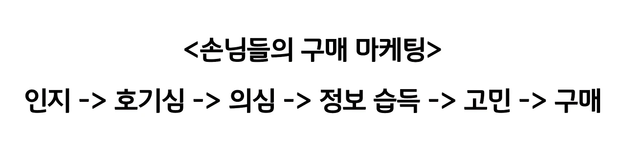 손님들의 구매 마케팅은 인지, 호기심, 의심, 정보 습득, 고민, 구매를 거친다.