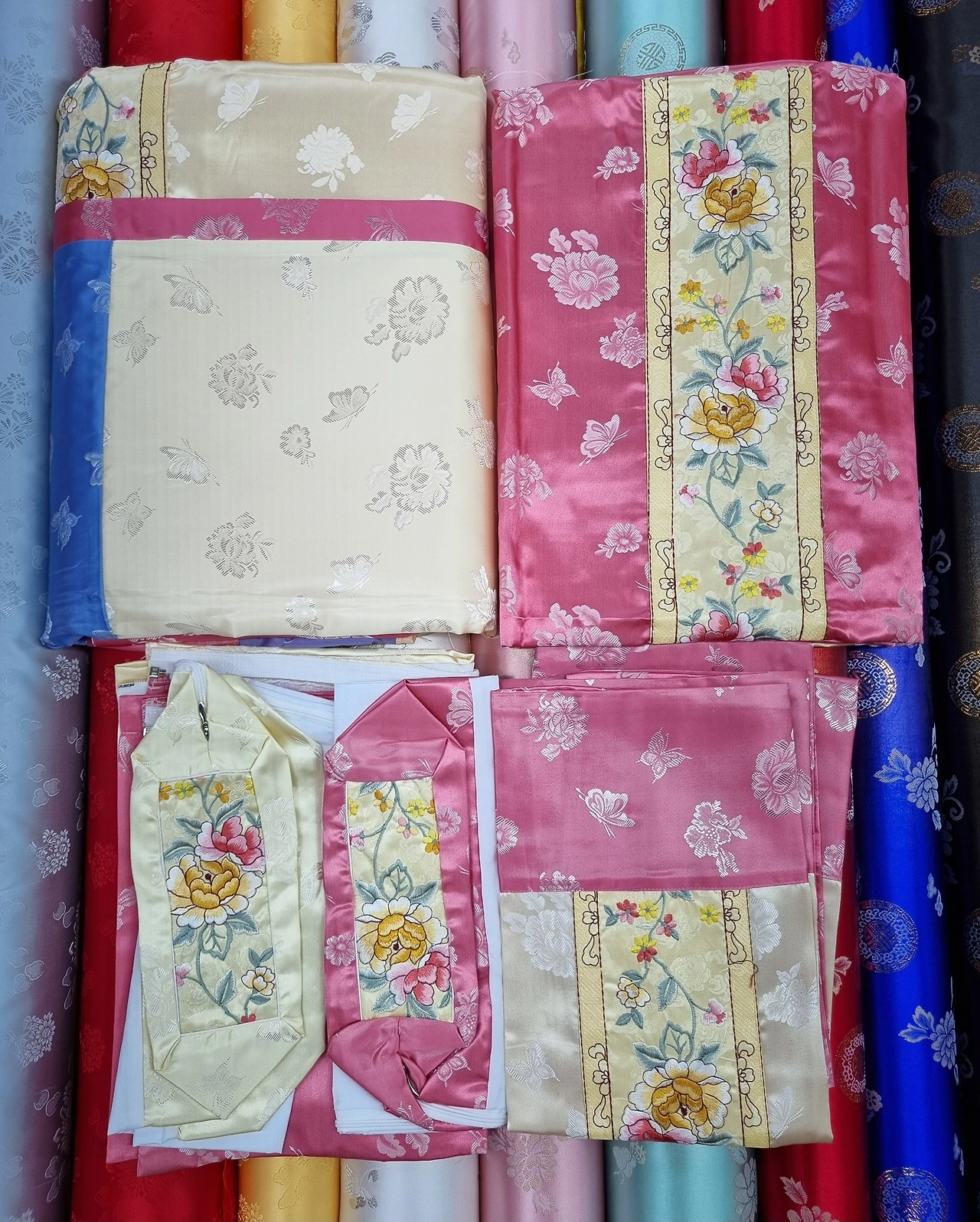 처음에는 기존에 있었던 양단 위주로 판매를 했지만 시간이 지나면서 다른 품목들을 찾는 손님들이 생기면서 새로운 품목들을 하나씩 하나씩 추가하게 되었다. 여기서는 주요 품목인 양단, 색동, 얇은 원단, 보자기, 이불보, 조각보 이불, 한실 이불 등에 대해서 이야기하겠다.