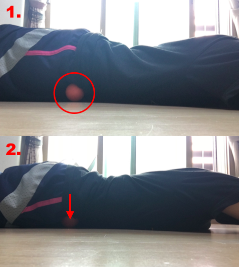 (1) 골반뼈 살짝 안쪽 뼈에 공을 대고 엎드려준다.