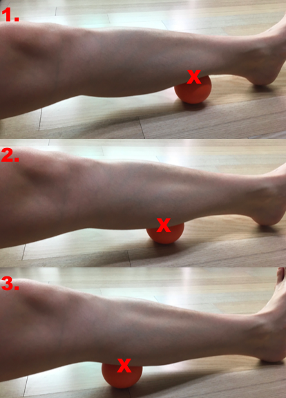 (1) 그림과 같이 종아리 아래쪽에 공을 놓고 체중을 실어 지그시 눌러준다.