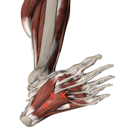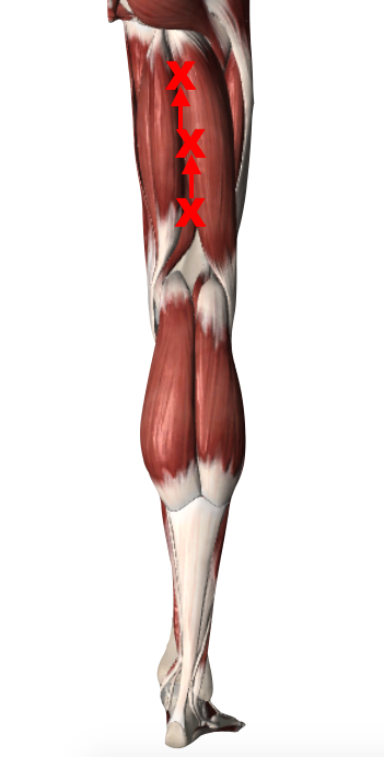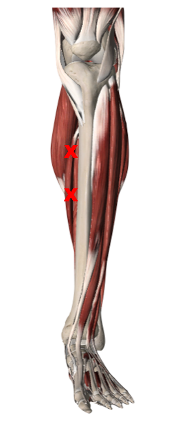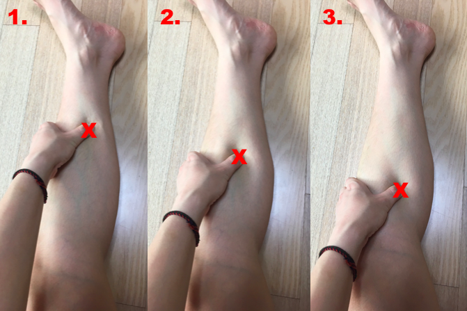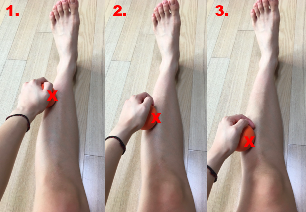 1. 경골이라는 뼈를 피해서 아래, 중간, 윗부분 3 부위를 공으로 지그시 눌러준다.