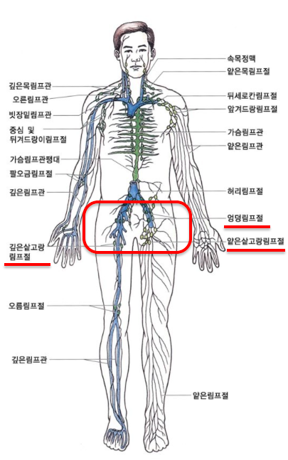 그림과 같이 골반쪽에 림프관에 연결통로인 림프절이 많이 모여있는 곳을 볼 수 있습니다. 이곳의 순환이 원활하지 않으면 종아리나 허벅지 라인을 마사지한다고 해도 심장까지 원활한 순환이 잘 되지 않을 수 있습니다. 그래서 첫 번째로 골반쪽에 있는 림프절들의 순환을 잘되게 해줌으로써 하지의 순환의 통로를 만들어 줍니다.
