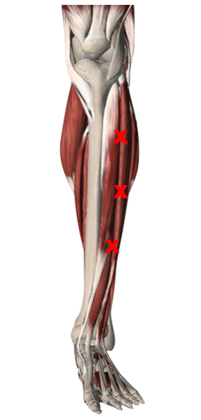 (2) 아킬레스건 바로 위쪽에서 한번, 종아리 근육이 올라오는 부근에서 한번, 오금 부위와 가까운 쪽에서 한 번씩 꾹 눌러준다.
