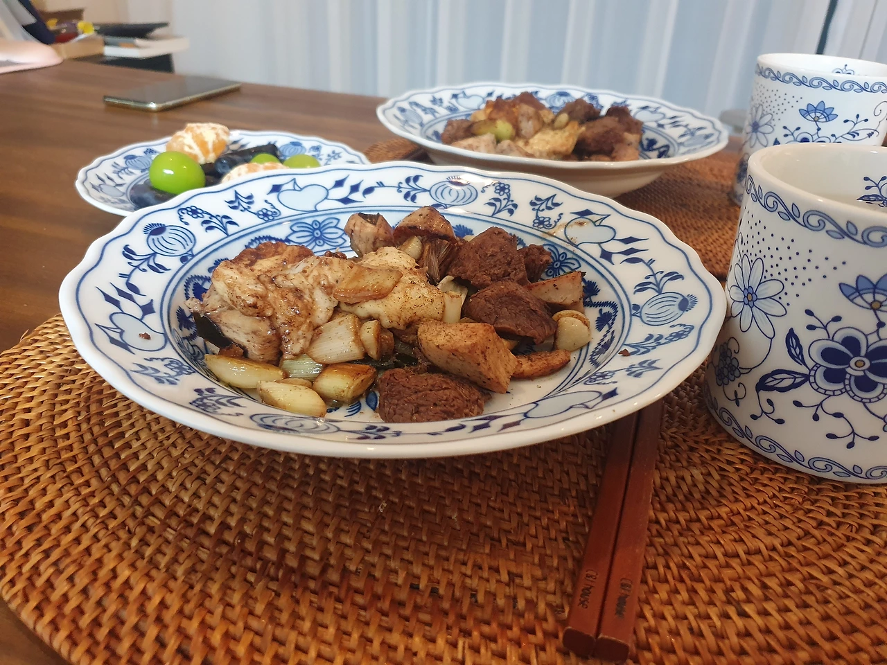 다시 저녁에 만나 소고기와 닭가슴살 그릴+과일 조금.
