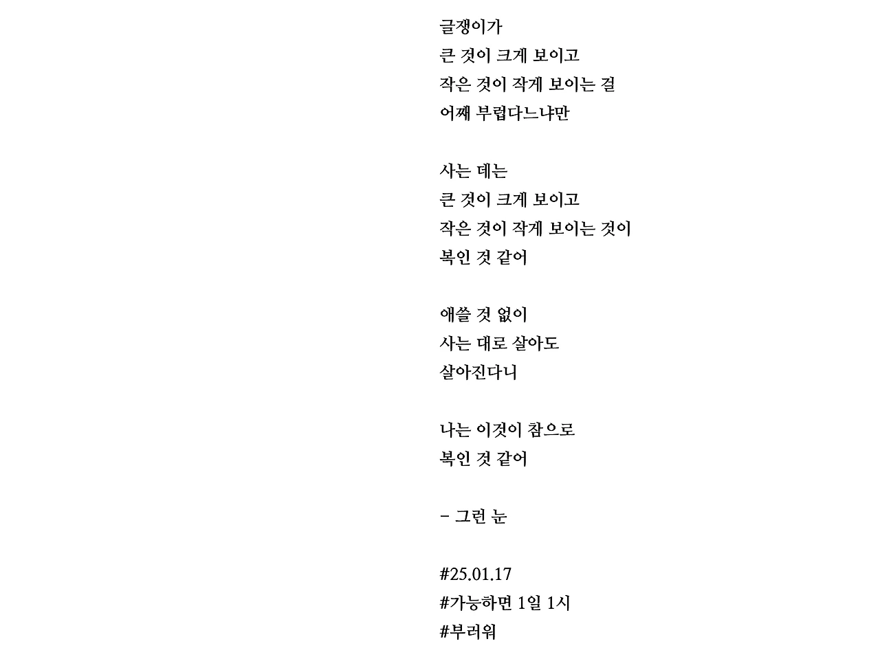 글쟁이가큰 것이 크게 보이고작은 것이 작게 보이는 걸어째 부럽다느냐만사는 데는큰 것이 크게 보이고작은 것이 작게 보이는 것이복인 것 같어애쓸 것 없이사는 대로 살아도살아진다니나는 이것이 참으로복인 것 같어 - 그런 눈#25.01.17#가능하면 1일 1시#부러워
