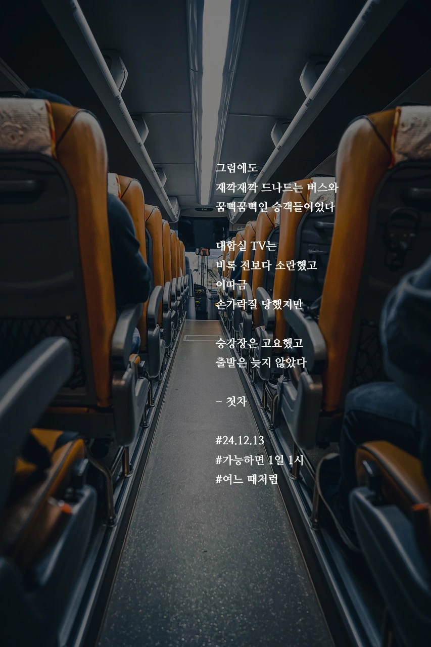그럼에도재깍재깍 드나드는 버스와꿈뻑꿈뻑인 승객들이었다대합실 TV는비록 전보다 소란했고이따금손가락질 당했지만승강장은 고요했고출발은 늦지 않았다- 첫차#24.12.13#가능하면 1일 1시#여느 때처럼 작가의 말: 그럼에도 우리는 살아가고