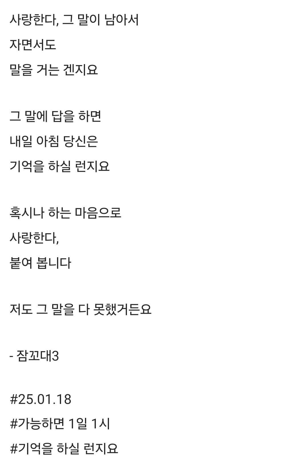 사랑한다, 그 말이 남아서자면서도말을 거는 겐지요그 말에 답을 하면내일 아침 당신은기억을 하실 런지요혹시나 하는 마음으로사랑한다,붙여 봅니다저도 그 말을 다 못했거든요- 잠꼬대3#25.01.18#가능하면 1일 1시 #기억을 하실 런지요