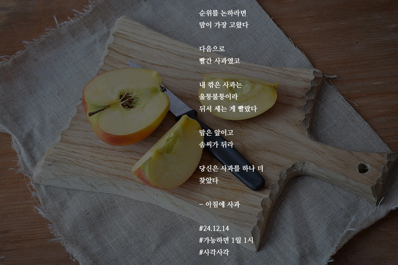 순위를 논하라면맘이 가장 고왔다다음으로빨간 사과였고내 깎은 사과는울퉁불퉁이라뒤서 세는 게 빨랐다맘은 앞이고솜씨가 뒤라당신은 사과를 하나 더찾았다- 아침에 사과#24.12.14#가능하면 1일 1시#사각사각