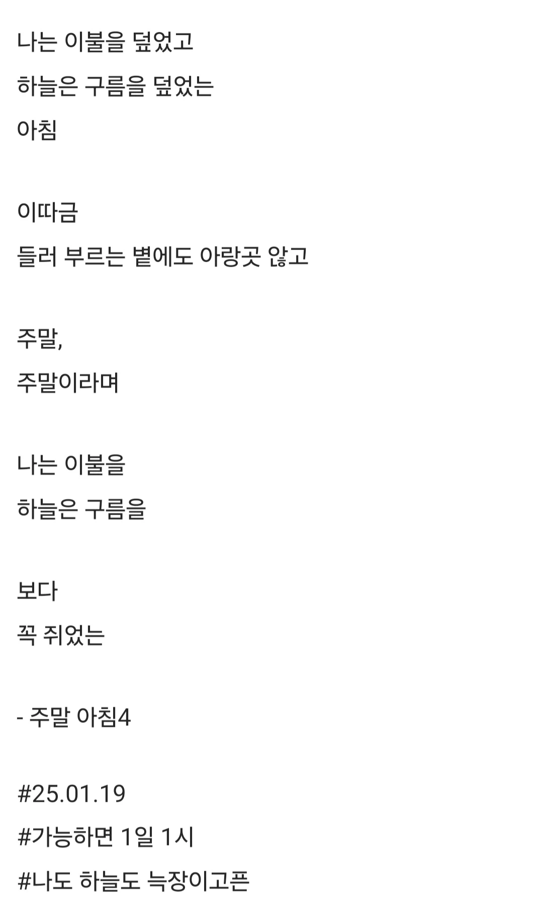 나는 이불을 덮었고하늘은 구름을 덮었는아침이따금들러 부르는 볕에도 아랑곳 않고주말,주말이라며나는 이불을하늘은 구름을보다꼭 쥐었는- 주말 아침4#25.01.19#가능하면 1일 1시 #나도 하늘도 늑장이고픈
