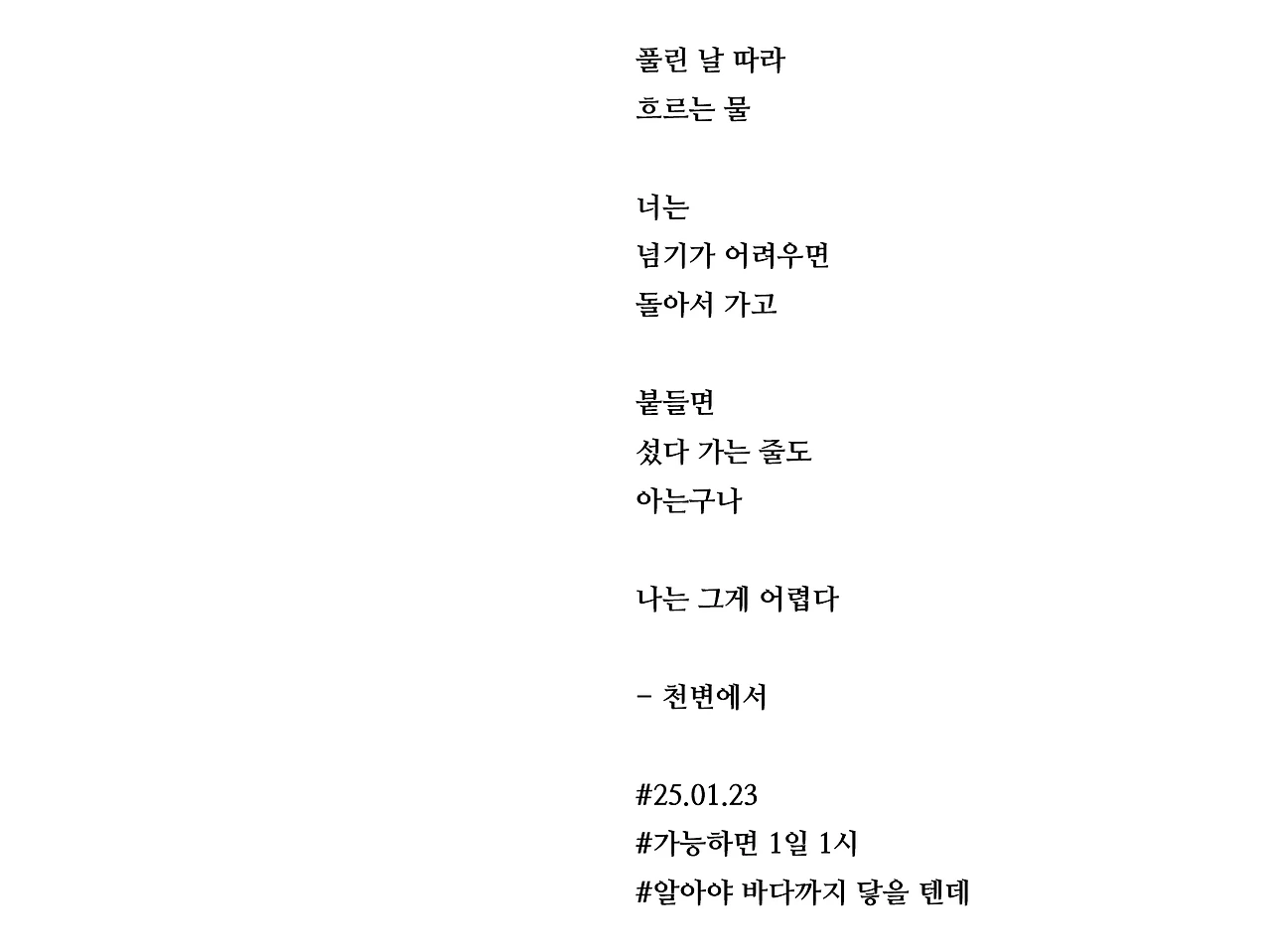 풀린 날 따라흐르는 물너는넘기가 어려우면돌아서 가고붙들면섰다 가는 줄도아는구나나는 그게 어렵다- 천변에서#25.01.23#가능하면 1일 1시#알아야 바다까지 닿을 텐데