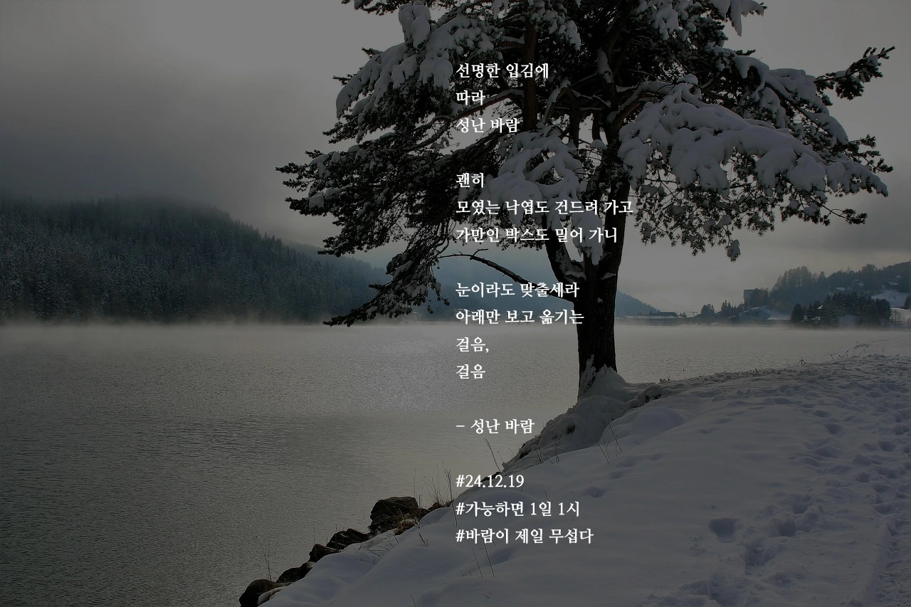 선명한 입김에따라성난 바람괜히모였는 낙엽도 건드려 가고가만인 박스도 밀어 가니눈이라도 맞출세라아래만 보고 옮기는걸음,걸음- 성난 바람#24.12.19#가능하면 1일 1시#바람이 제일 무섭다