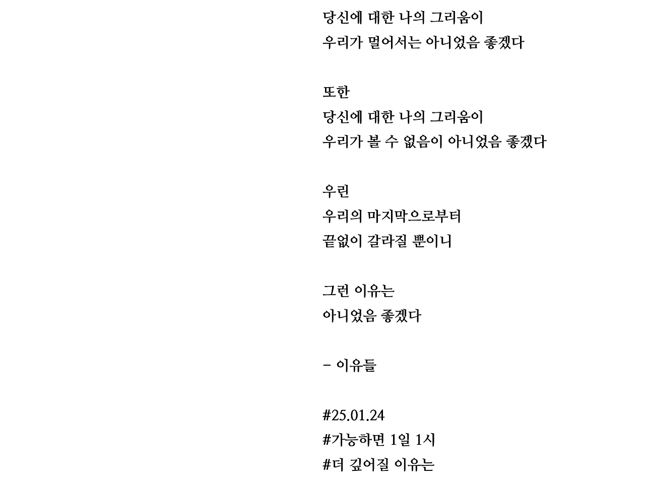 당신에 대한 나의 그리움이우리가 멀어서는 아니었음 좋겠다또한당신에 대한 나의 그리움이우리가 볼 수 없음이 아니었음 좋겠다우린우리의 마지막으로부터끝없이 갈라질 뿐이니그런 이유는아니었음 좋겠다- 이유들#25.01.24#가능하면 1일 1시#더 깊어질 이유는