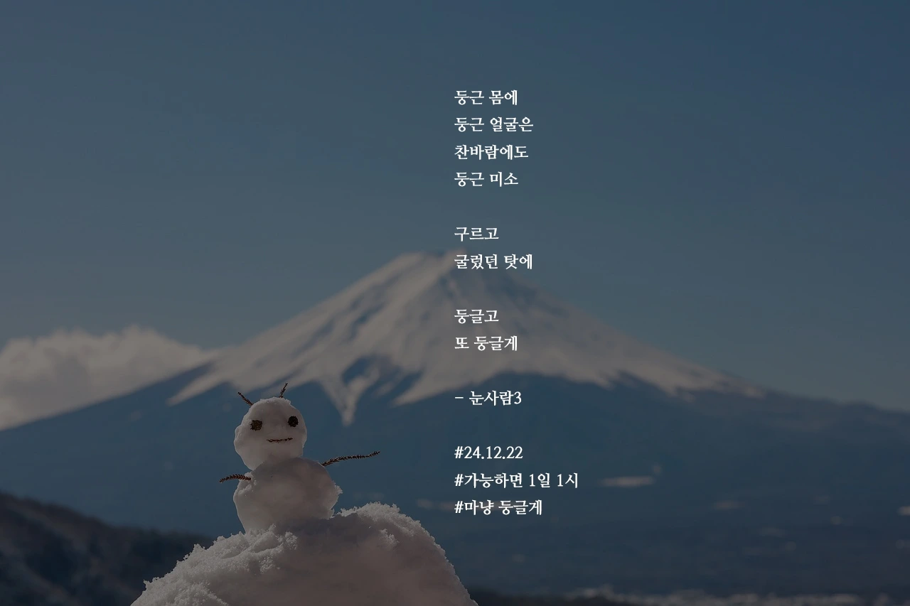 둥근 몸에둥근 얼굴은찬바람에도둥근 미소구르고굴렀던 탓에둥글고또 둥글게- 눈사람3#24.12.22#가능하면 1일 1시#마냥 둥글게 작가의 말: 살아야지, 둥글게 둥글게