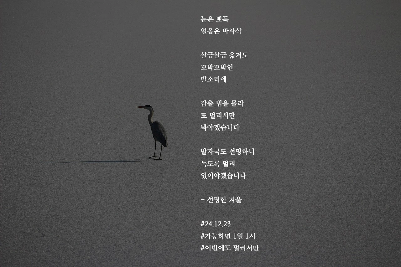 눈은 뽀득얼음은 바사삭살금살금 옮겨도꼬박꼬박인발소리에감출 법을 몰라또 멀리서만봐야겠습니다발자국도 선명하니녹도록 멀리있어야겠습니다- 선명한 겨울#24.12.23#가능하면 1일 1시#이번에도 멀리서만