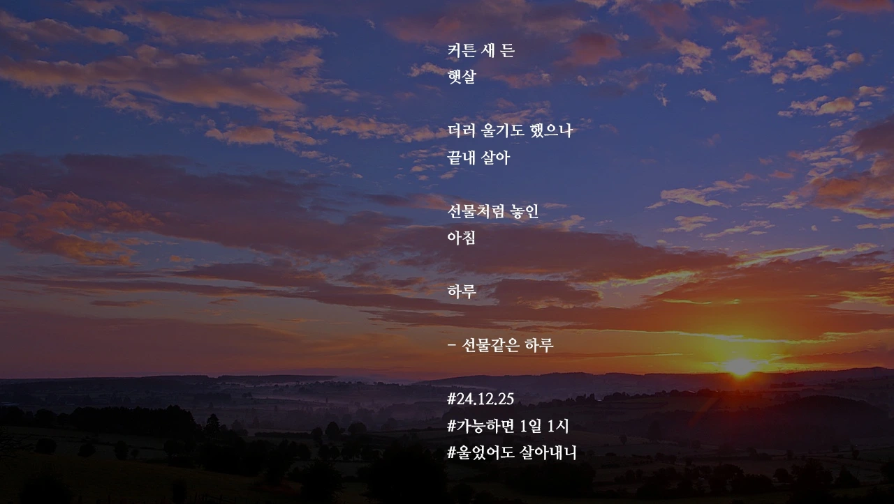 커튼 새 든햇살더러 울기도 했으나끝내 살아선물처럼 놓인아침하루- 선물같은 하루#24.12.25#가능하면 1일 1시#울었어도 살아내니 작가의 말: 살자, 끝까지