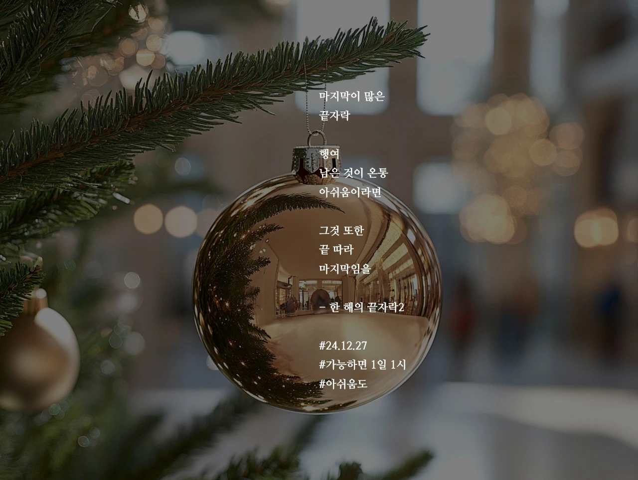 마지막이 많은끝자락행여남은 것이 온통아쉬움이라면그것 또한끝 따라마지막임을- 한 해의 끝자락2#24.12.27#가능하면 1일 1시#아쉬움도