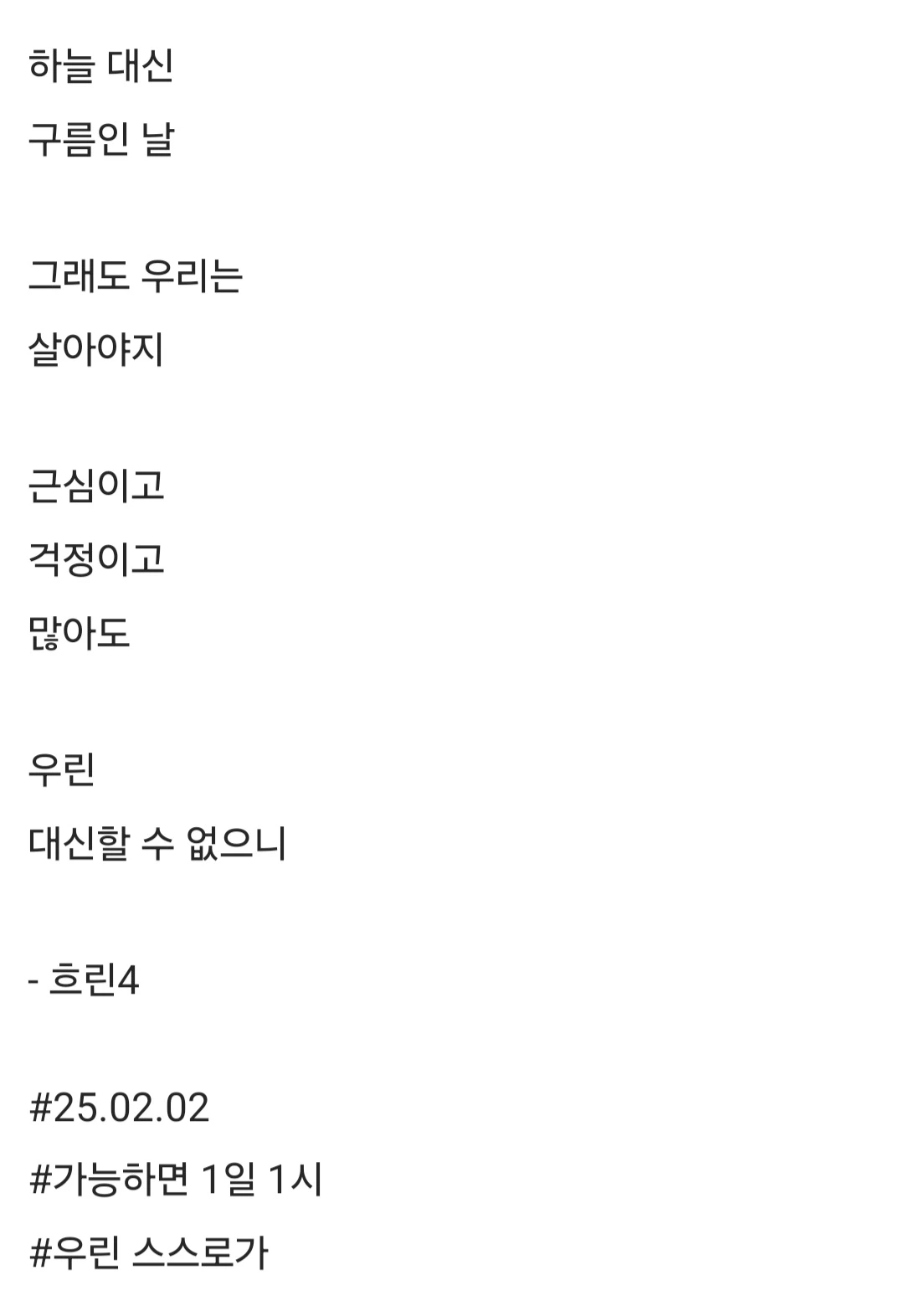 하늘 대신구름인 날그래도 우리는살아야지근심이고걱정이고많아도우린대신할 수 없으니- 흐린4#25.02.02#가능하면 1일 1시#우린 스스로가
