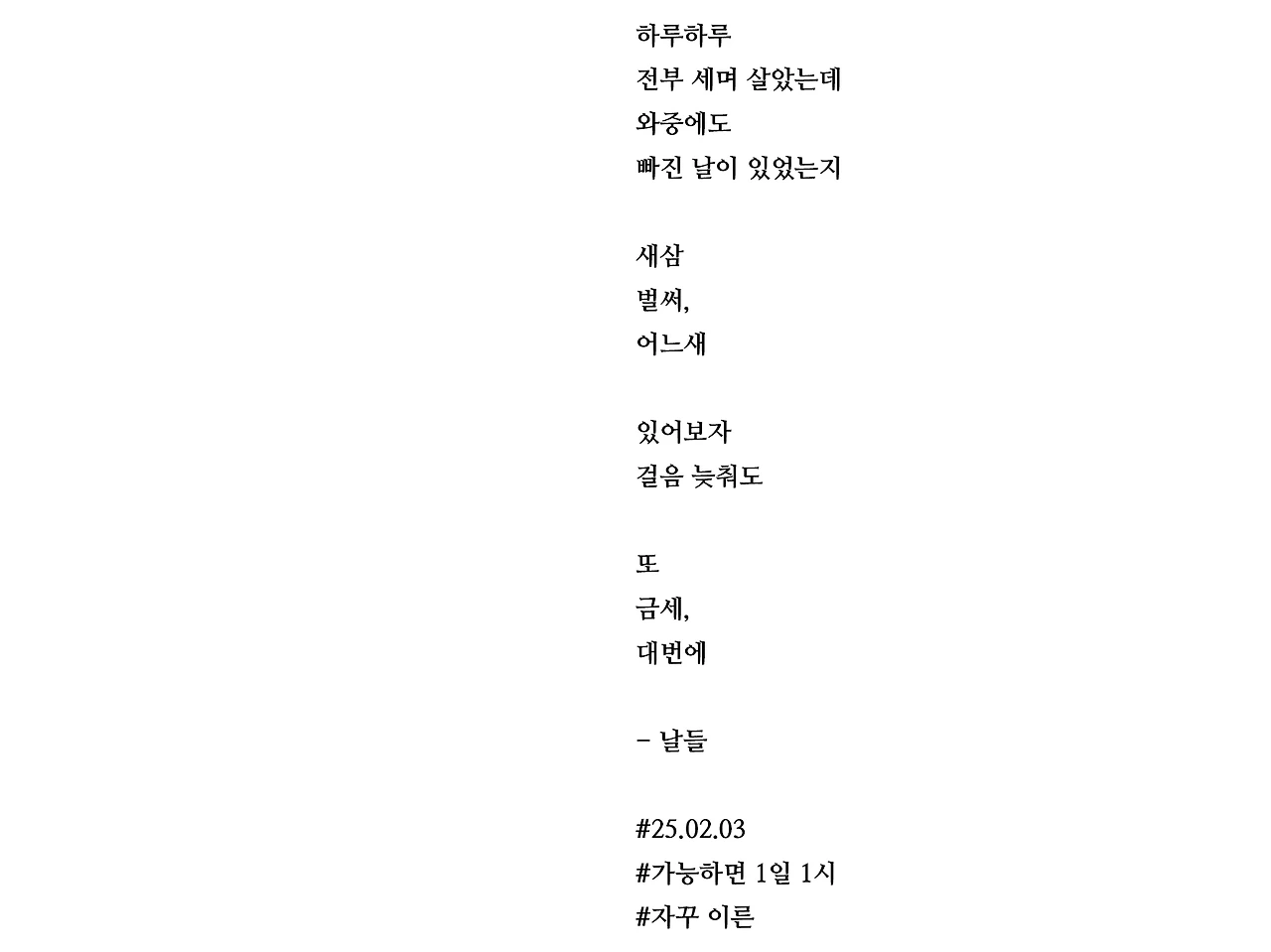 하루하루전부 세며 살았는데와중에도빠진 날이 있었는지새삼벌써,어느새있어보자걸음 늦춰도또금세,대번에- 날들#25.02.03#가능하면 1일 1시#자꾸 이른
