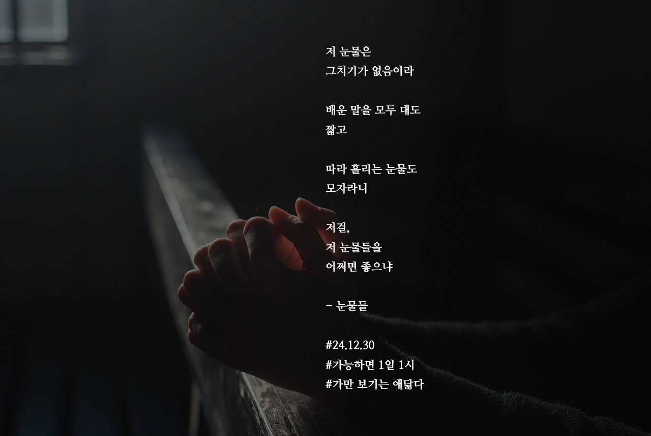 저 눈물은그치기가 없음이라배운 말을 모두 대도짧고따라 흘리는 눈물도모자라니저걸,저 눈물들을어쩌면 좋으냐- 눈물들#24.12.30#가능하면 1일 1시#가만 보기는 애닳다
