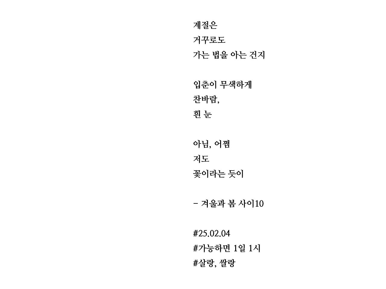 계절은거꾸로도가는 법을 아는 건지입춘이 무색하게찬바람,흰 눈아님, 어쩜저도꽃이라는 듯이- 겨울과 봄 사이10#25.02.04#가능하면 1일 1시#살랑, 쌀랑