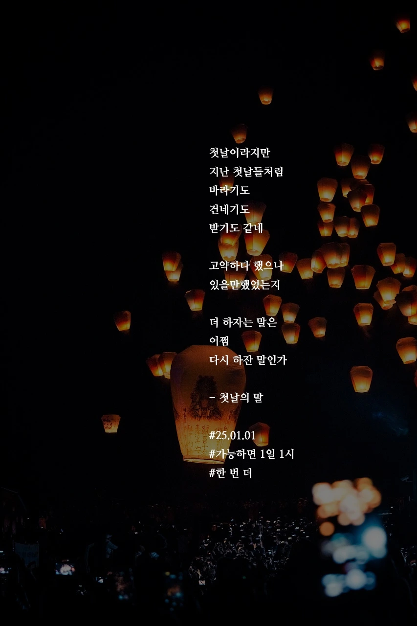 첫날이라지만지난 첫날들처럼바라기도건네기도받기도 같네고약하다 했으나있을만했었는지더 하자는 말은어쩜다시 하잔 말인가- 첫날의 말#25.01.01#가능하면 1일 1시#한 번 더 작가의 말: 잘 해보자, 또 한 번