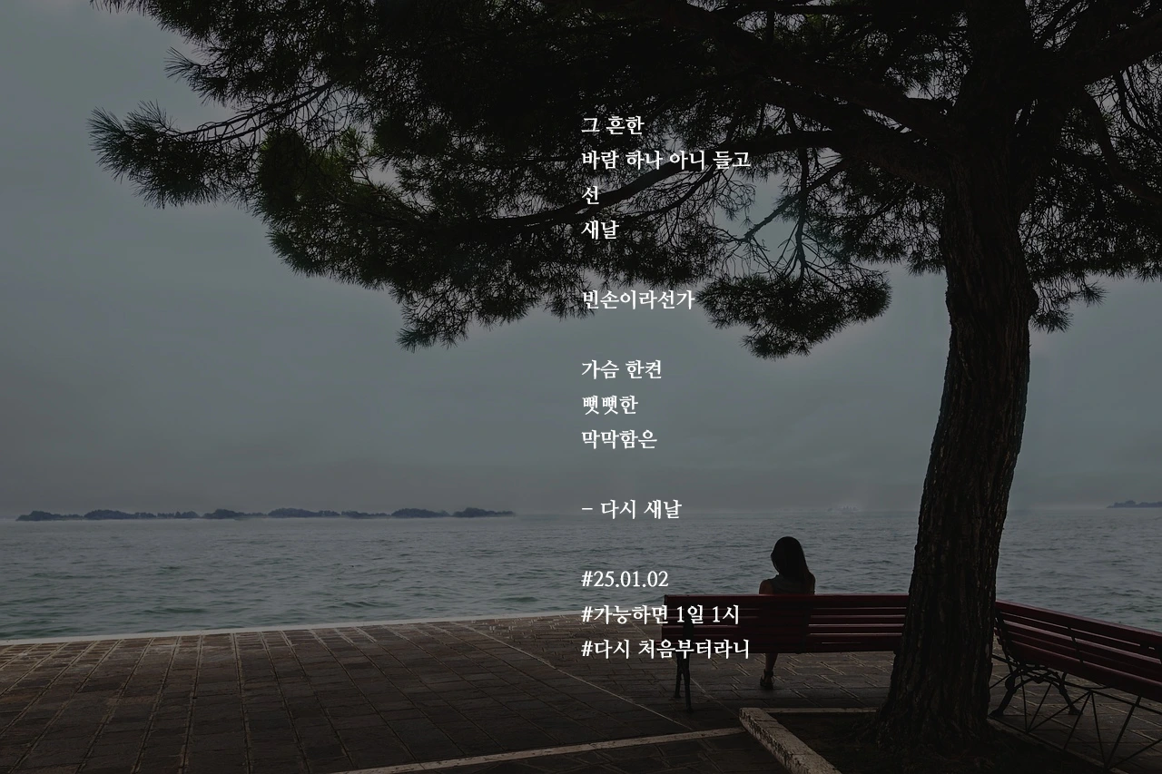 그 흔한바람 하나 아니 들고선새날빈손이라선가가슴 한켠뻣뻣한막막함은- 다시 새날#25.01.02#가능하면 1일 1시#다시 처음부터라니