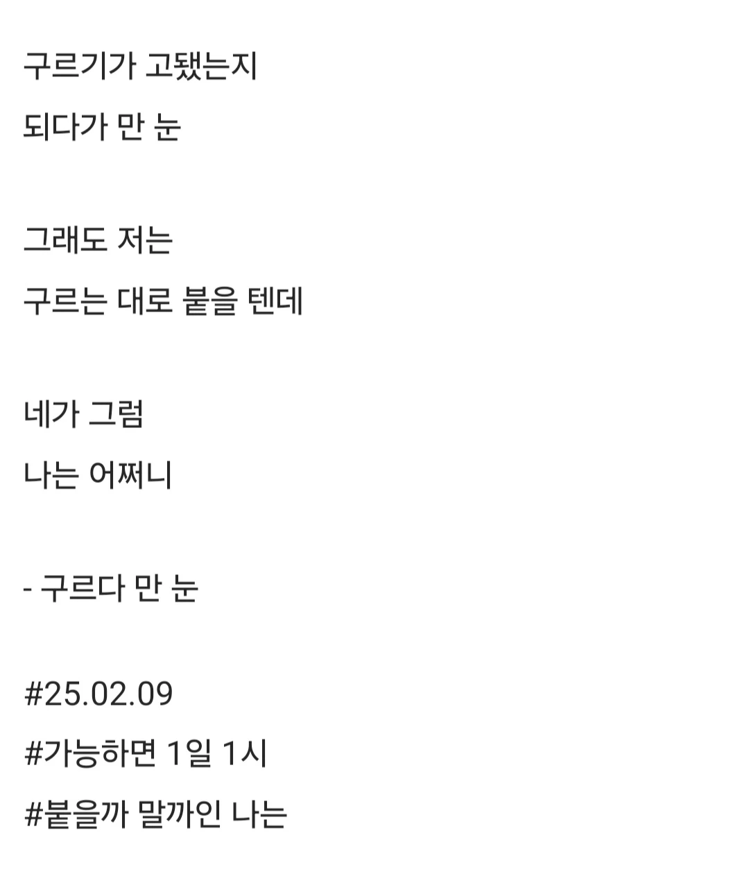 구르기가 고됐는지되다가 만 눈그래도 저는구르는 대로 붙을 텐데네가 그럼나는 어쩌니- 구르다 만 눈#25.02.09#가능하면 1일 1시#붙을까 말까인 나는