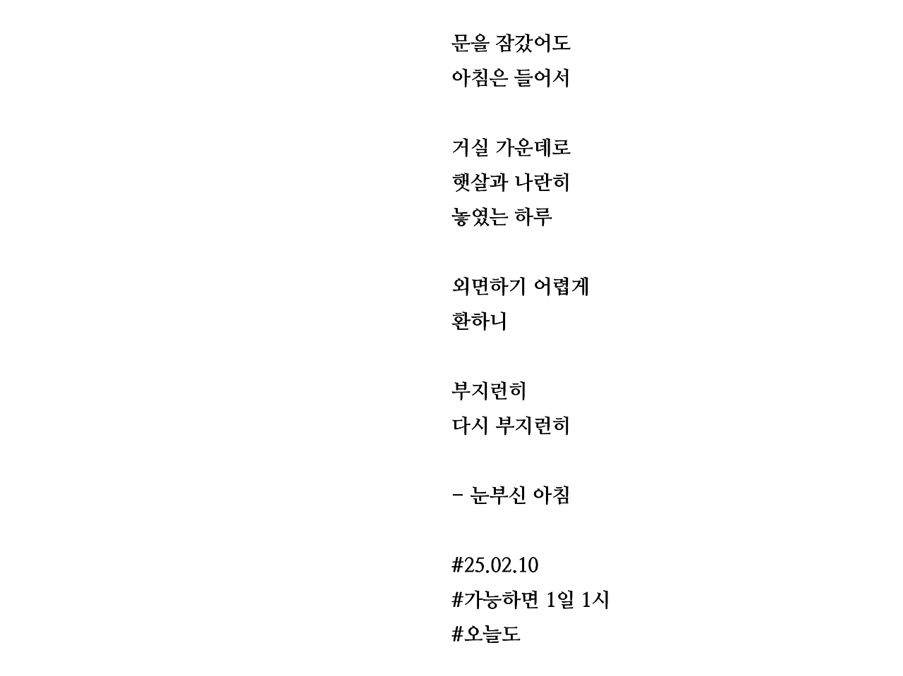 문을 잠갔어도아침은 들어서거실 가운데로햇살과 나란히놓였는 하루외면하기 어렵게환하니부지런히다시 부지런히- 눈부신 아침#25.02.10#가능하면 1일 1시#오늘도