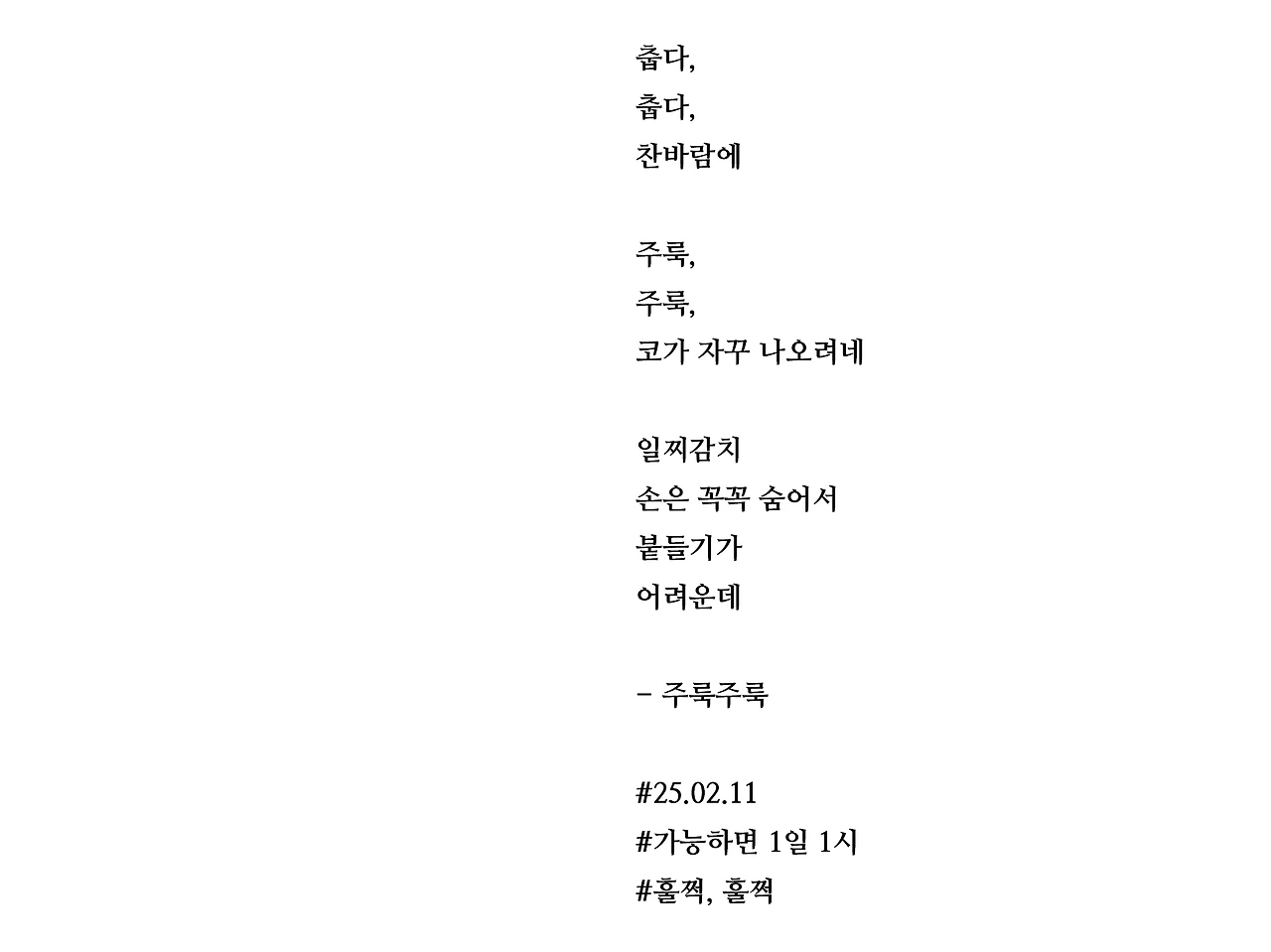 춥다,춥다,찬바람에주룩,주룩,코가 자꾸 나오려네일찌감치손은 꼭꼭 숨어서붙들기가어려운데- 주룩주룩#25.02.11#가능하면 1일 1시#훌쩍, 훌쩍