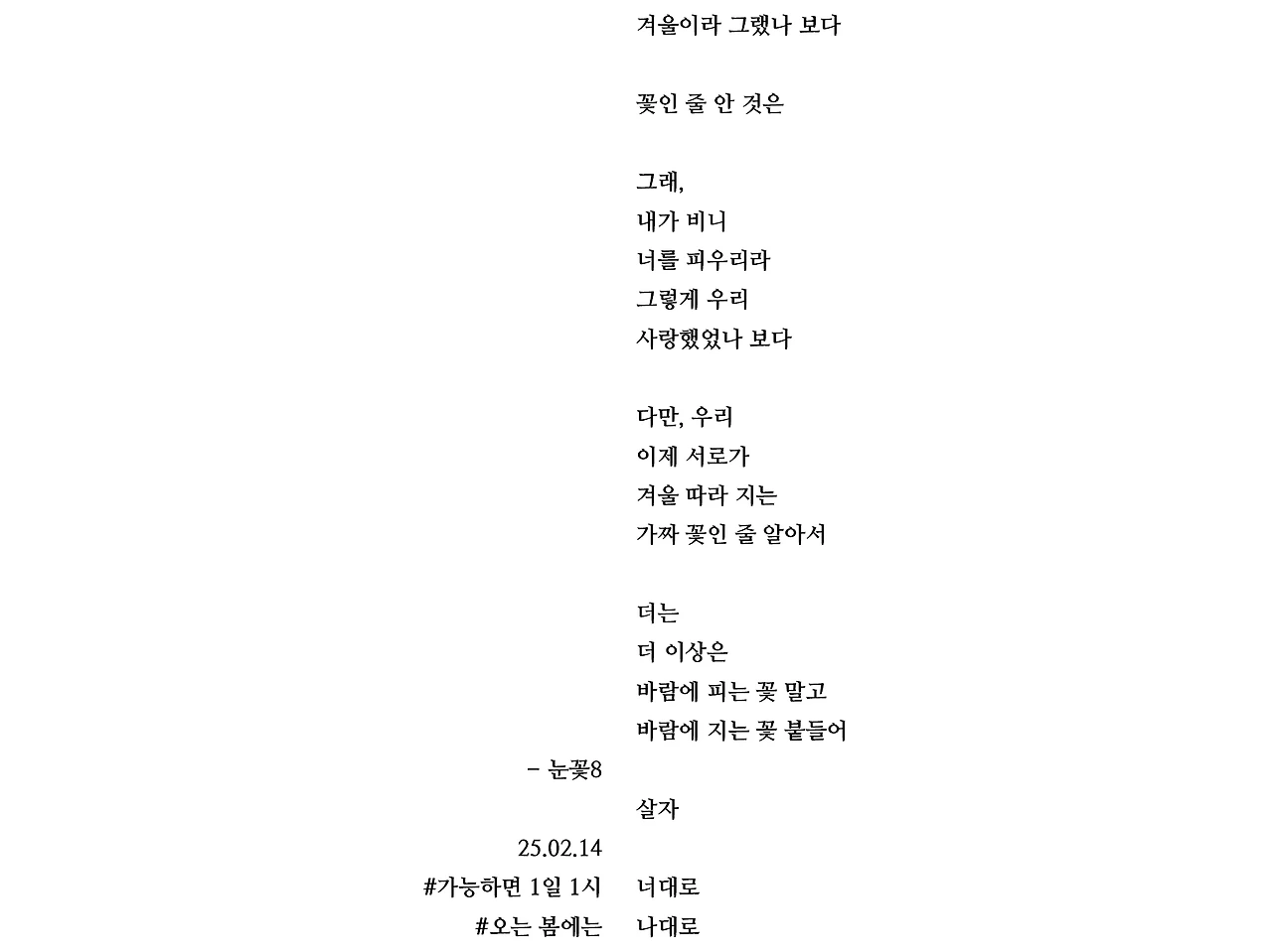 겨울이라 그랬나 보다꽃인 줄 안 것은그래,내가 비니너를 피우리라그렇게 우리사랑했었나 보다다만, 우리이제 서로가겨울 따라 지는가짜 꽃인 줄 알아서더는더 이상은바람에 피는 꽃 말고바람에 지는 꽃 붙들어살자너대로나대로- 눈꽃8#25.02.14#가능하면 1일 1시#오는 봄에는