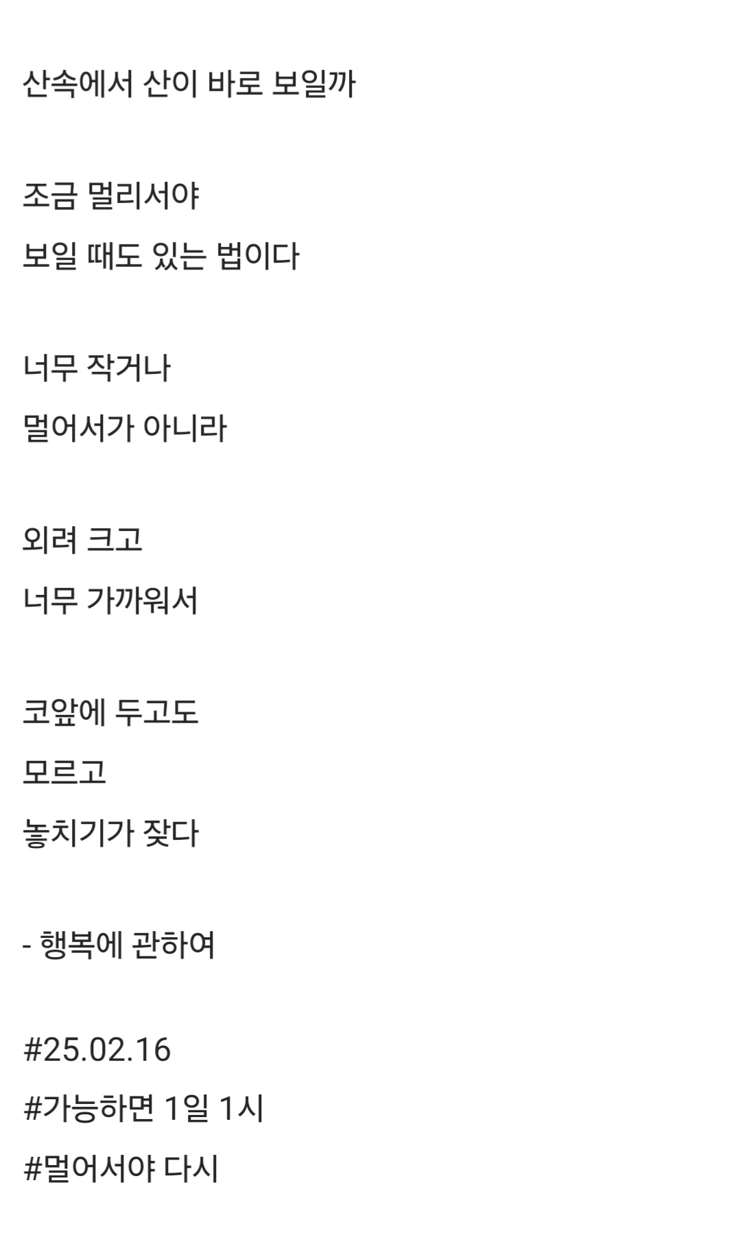 산속에서 산이 바로 보일까조금 멀리서야보일 때도 있는 법이다너무 작거나멀어서가 아니라외려 크고너무 가까워서코앞에 두고도모르고놓치기가 잦다- 행복에 관하여#25.02.16#가능하면 1일 1시 #멀어서야 다시