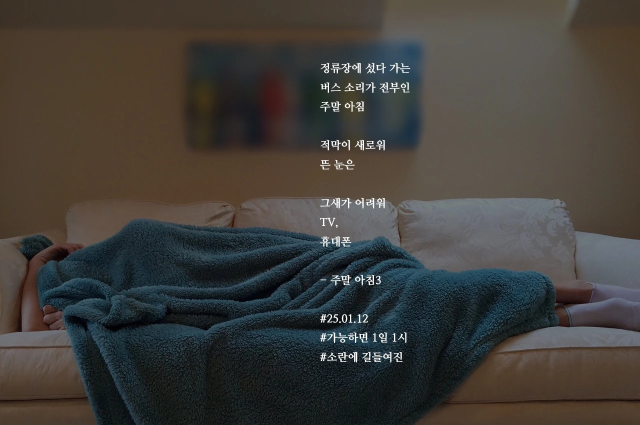 정류장에 섰다 가는버스 소리가 전부인주말 아침적막이 새로워뜬 눈은그새가 어려워TV,휴대폰- 주말 아침3#25.01.12#가능하면 1일 1시 #소란에 길들여진 작가의 말: 오늘도 비슷한