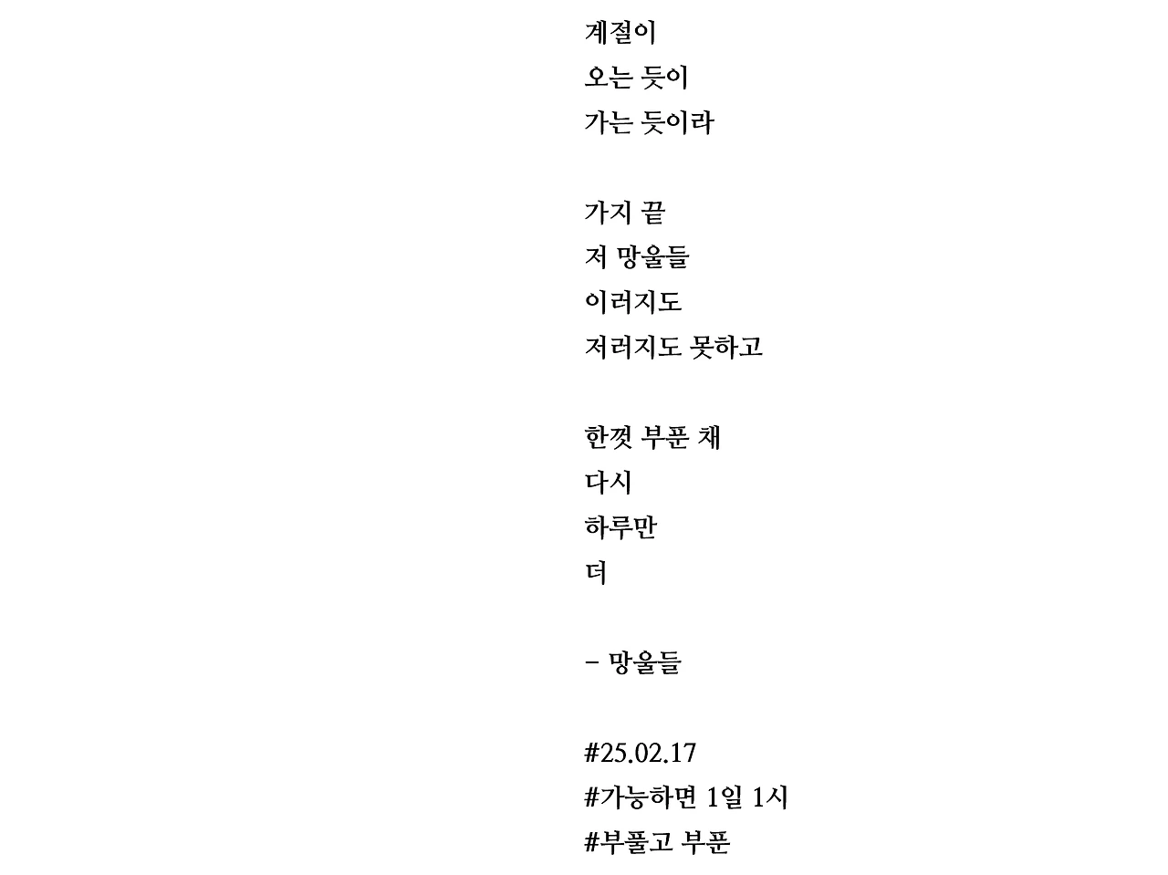 계절이오는 듯이가는 듯이라가지 끝저 망울들이러지도저러지도 못하고한껏 부푼 채다시하루만더- 망울들#25.02.17#가능하면 1일 1시#부풀고 부푼