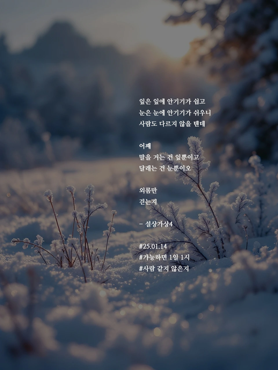 잎은 잎에 안기기가 쉽고눈은 눈에 안기기가 쉬우니사람도 다르지 않을 텐데어째말을 거는 건 잎뿐이고달래는 건 눈뿐이오외롬만걷는지- 설상가상4#25.01.14#가능하면 1일 1시#사람 같지 않은지