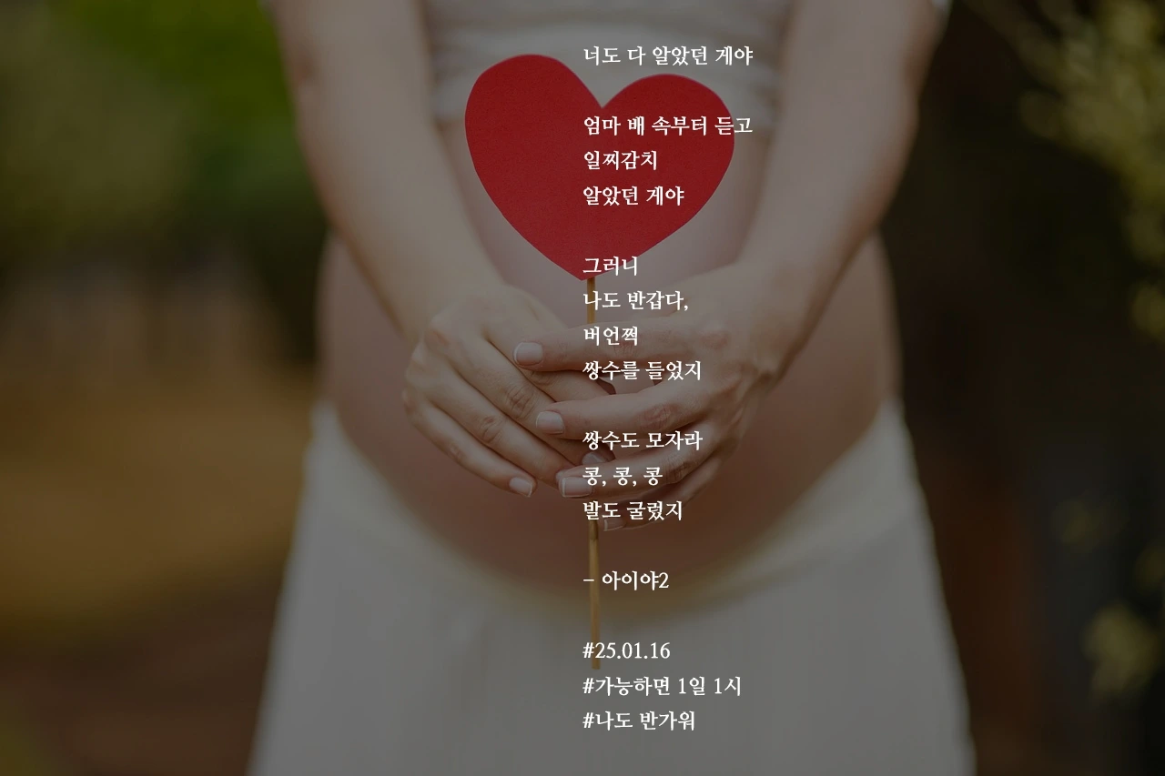 너도 다 알았던 게야엄마 배 속부터 듣고일찌감치알았던 게야그러니나도 반갑다,버언쩍쌍수를 들었지쌍수도 모자라콩, 콩, 콩발도 굴렀지- 아이야2#25.01.16#가능하면 1일 1시#나도 반가워