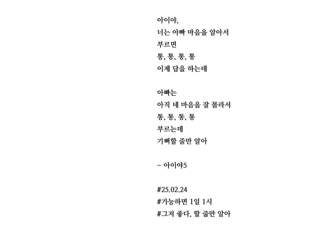 아이야,너는 아빠 마음을 알아서부르면통, 통, 통, 통이제 답을 하는데아빠는아직 네 마음을 잘 몰라서통, 통, 통, 통부르는데기뻐할 줄만 알아- 아이야5#25.02.24#가능하면 1일 1시#그저 좋다, 할 줄만 알아